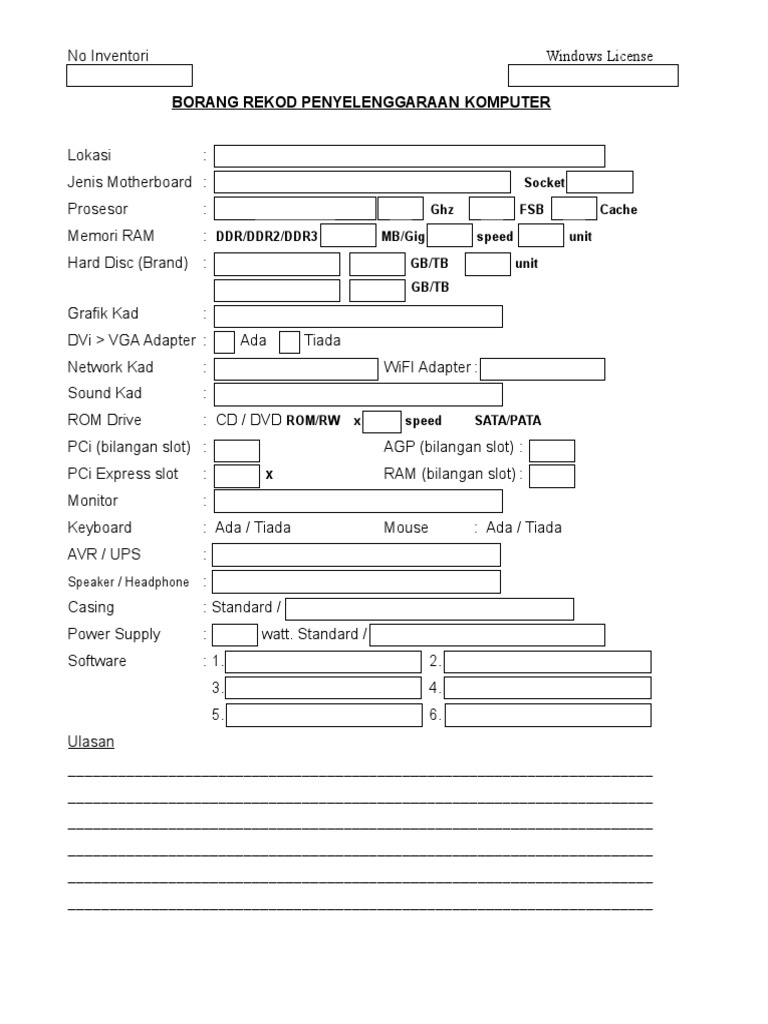 MOshims: Borang Penyelenggaraan Pencegahan from lh3.googleusercontent.com (korsleting)melakukan perawatan komputer melalui hardware maupun software. 4.2 penyelenggaraan komputer penyelenggaraan komputer secara. Borang penyelenggaraan komputer (page 1). Format contoh formulir evaluasi penyelenggaraan pelatihan.pdf. Contoh format borang penyelenggaraan komputer 2 cute766. Cpu merupakan sebuah unit proses yang paling utama dalam sebuah perangkat komputer. Documents similar to contoh format borang penyelenggaraan komputer 2. Oke yang pertama akan admin bahas ini adalah inti dari software komputer atau perangkat utama yang memang harus ada pada setiap komputer, sistem operasi ini peranannya sangat one thought on contoh perangkat lunak komputer, fungsi beserta gambarnya.